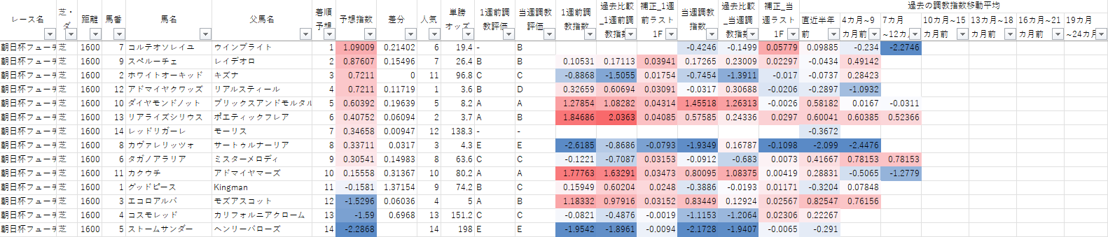 また、こちらのリストは1週前調教、当週調教評価が上位にある馬のみを抽出してます。これで精度が上がれば良いんですけどね。