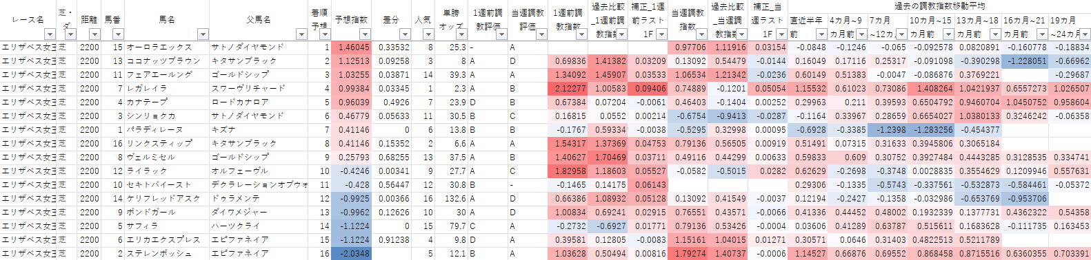 あと、1週前、当週の調教データが取得できなかった馬でもこれまでの調教指数の平均値が分かればある程度の参考にはなるかなと思い、予想に追加しました。