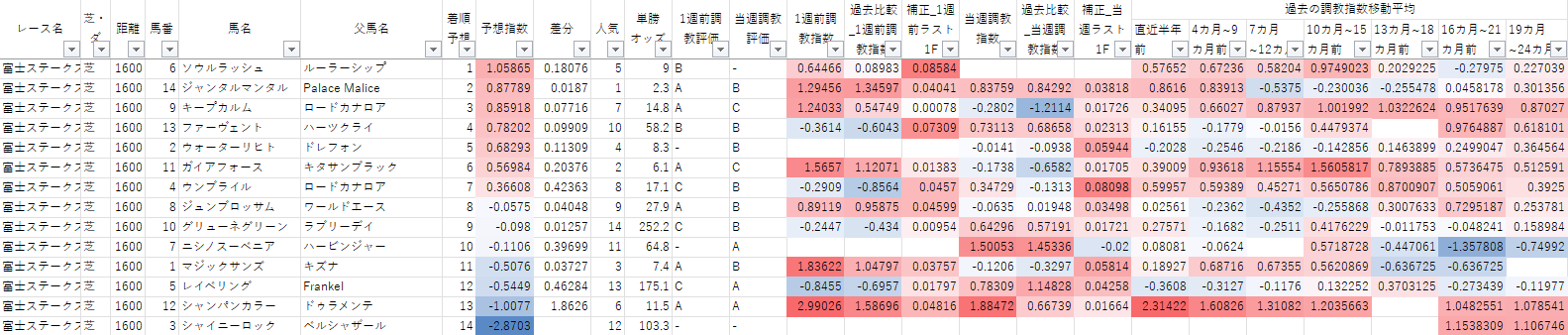 あと、1週前、当週の調教データが取得できなかった馬でもこれまでの調教指数の平均値が分かればある程度の参考にはなるかなと思い、予想に追加しました。