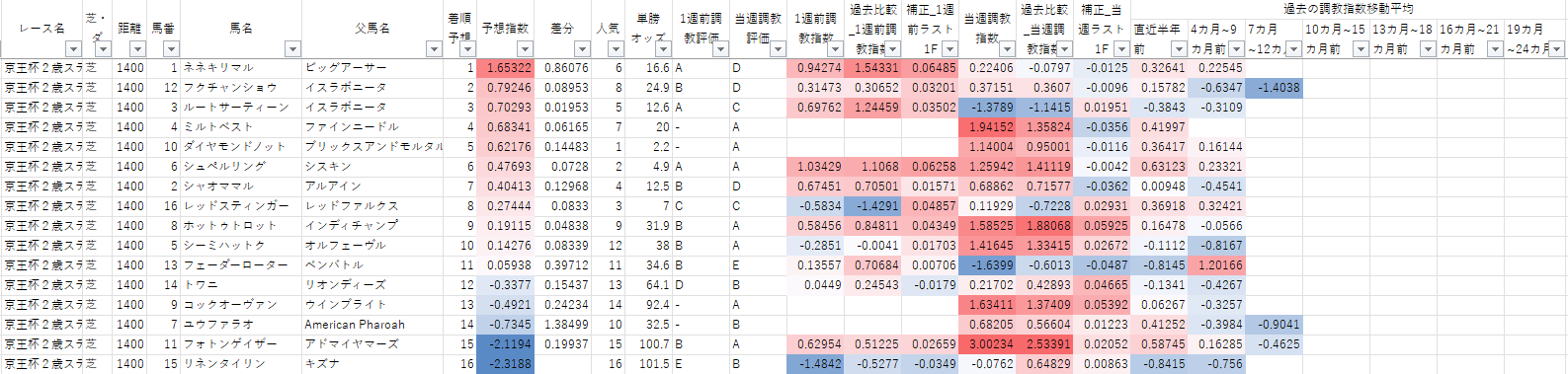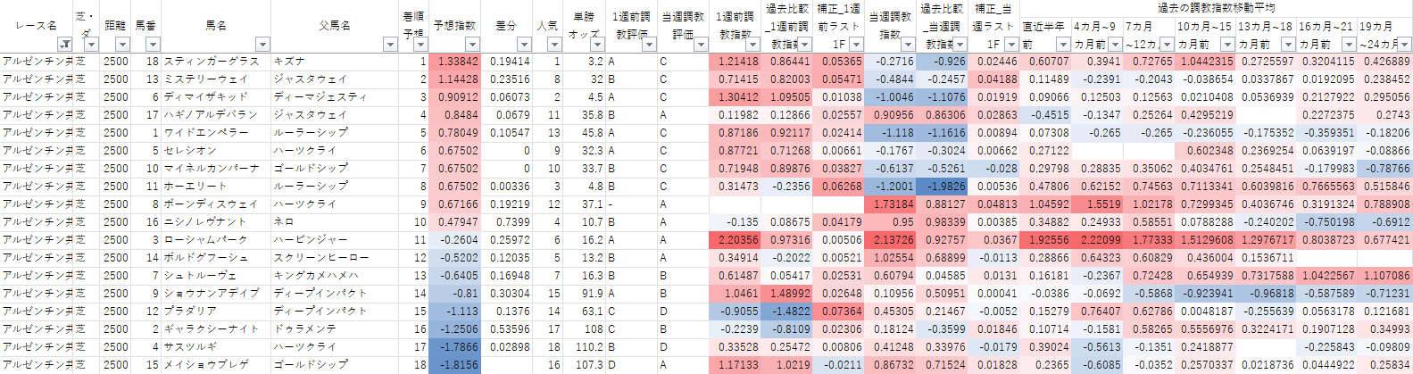 あと、1週前、当週の調教データが取得できなかった馬でもこれまでの調教指数の平均値が分かればある程度の参考にはなるかなと思い、予想に追加しました。