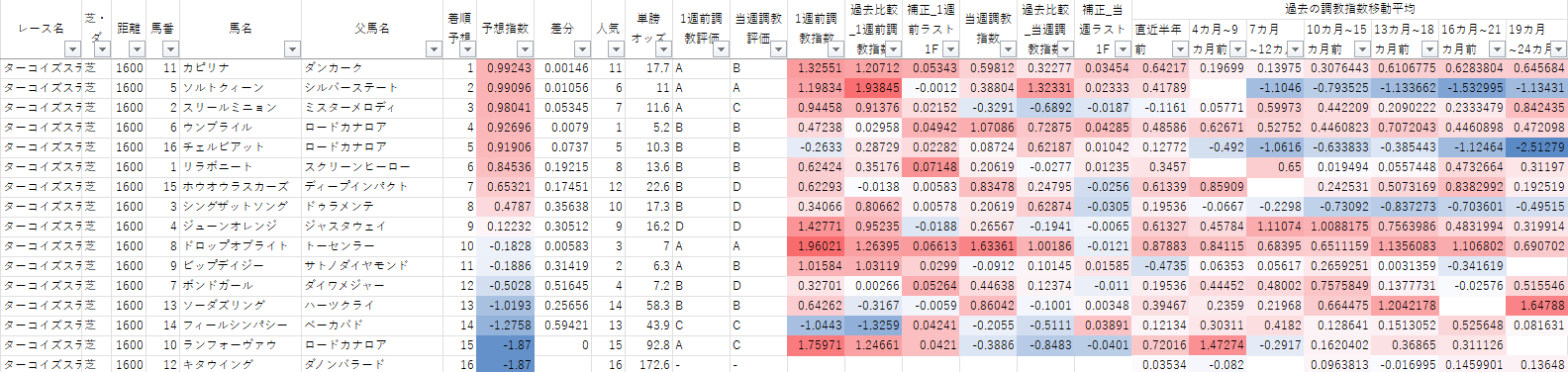 あと、1週前、当週の調教データが取得できなかった馬でもこれまでの調教指数の平均値が分かればある程度の参考にはなるかなと思い、予想に追加しました。