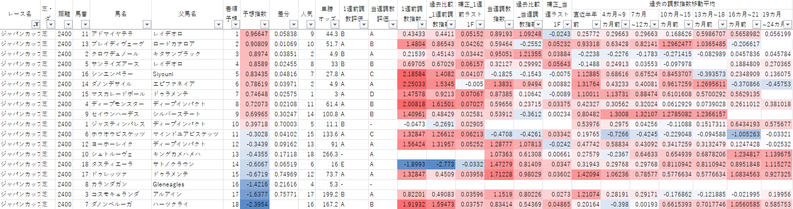 あと、1週前、当週の調教データが取得できなかった馬でもこれまでの調教指数の平均値が分かればある程度の参考にはなるかなと思い、予想に追加しました。