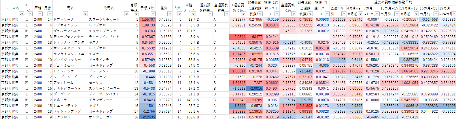 ※出走馬の種牡馬の競馬場、コース(芝orダート)、距離での実績データは廃止しました。代わりに調教指数の過去移動平均値を追加しています。